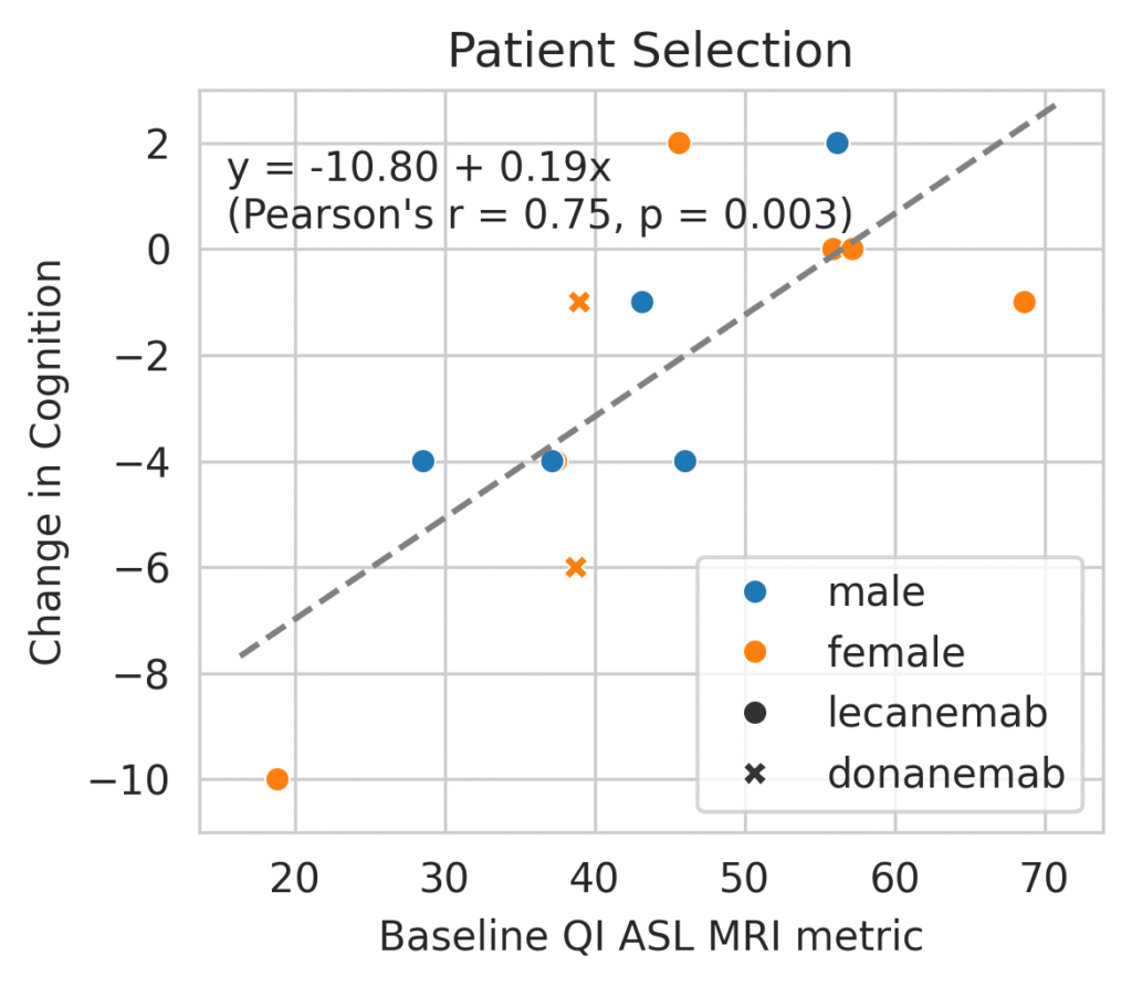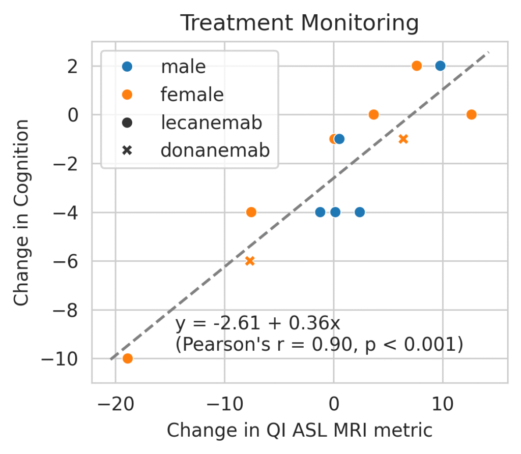 Following a cohort of patients receiving treatment for Alzheimer’s disease, QI ASL MRI biomarkers show exceptionally high correlation with cognitive outcomes. This gives doctors and patients objective evidence on whether the treatment is working or not.